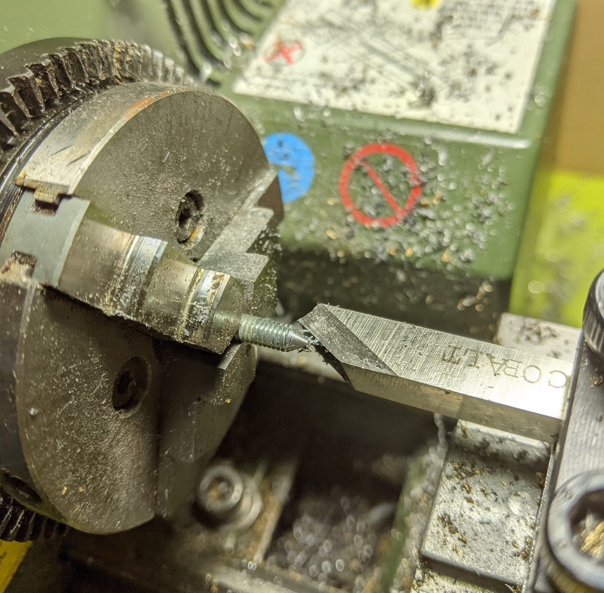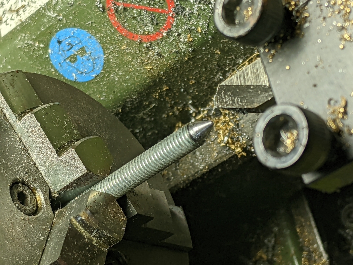 多少やりづらいのは、六角面が軸に対して平行ではないため、軸部の加工をするときにネジ先端が振り回され、うまくチャックできませんでした。