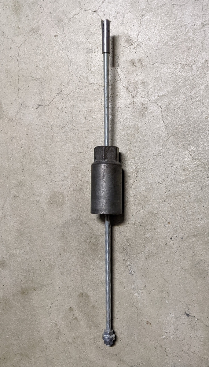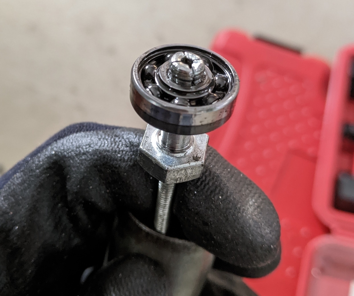 前回同様ソケットでスライドハンマーの要領で抜こうとしましたが抜けてこなかったので、ソケットを当て金にして寸切りボルトに通しておいたM5ナットをねじ込んでみると、ベアリングを引き抜くことができました。