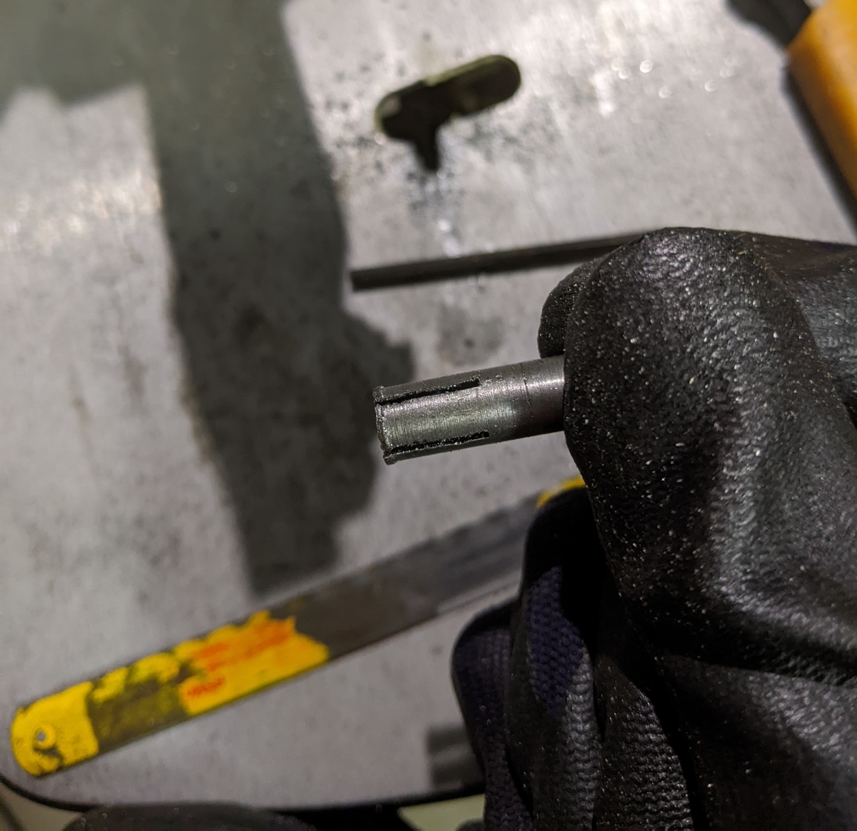 外径8mm、内径5mmのアルミパイプを短く切って、先端に数mm余裕を残してM6タップを立てて糸鋸で先端を十字に割った部品を作りました。