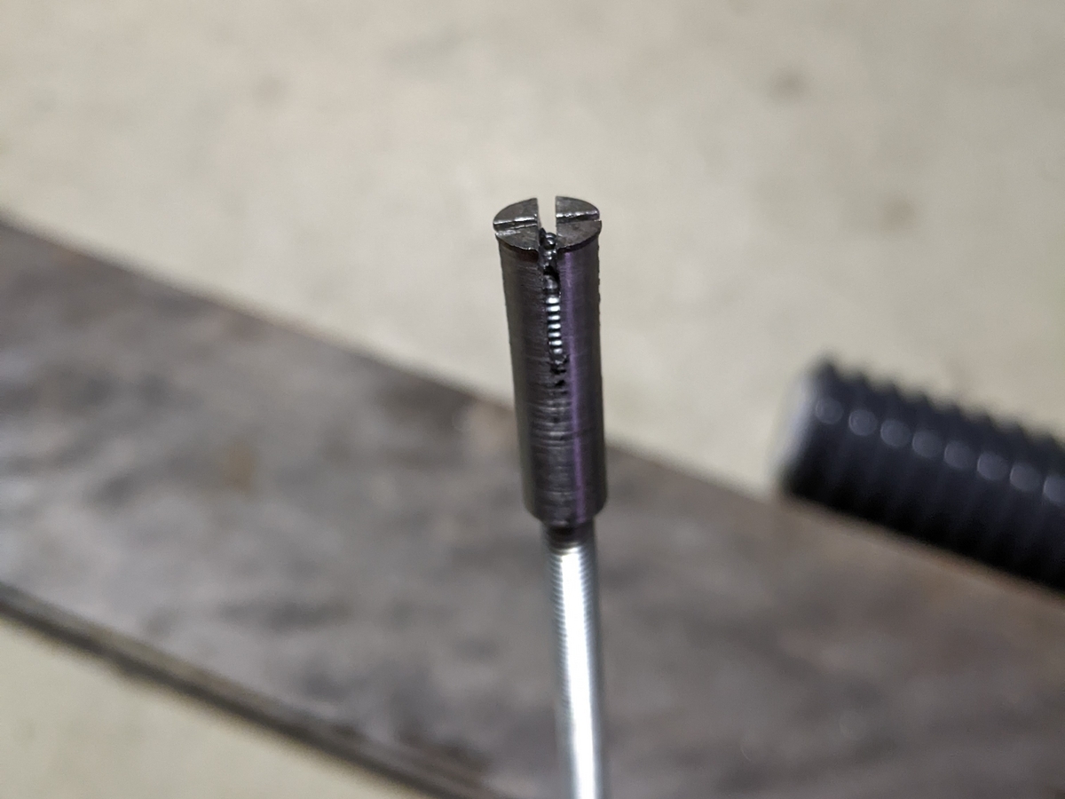 押しボルトを加工します。8mmと違い、手を抜いてタップの先端の不完全ネジ部を逃がすための押しボルトの先端の段を付けませんでした。