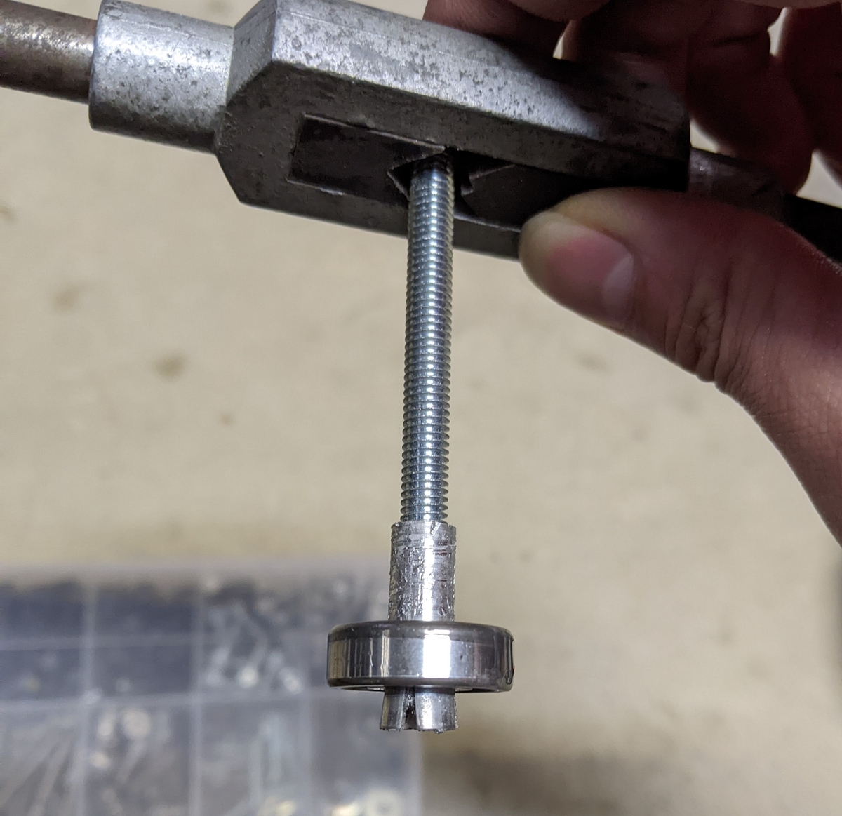 アダプタが滑って抜けてしまいベアリングは一向に抜けてこず、数回のチャレンジで5mm部分が塑性変形して雌ネジが出来上がってしまい、使い物にならなくなりました。