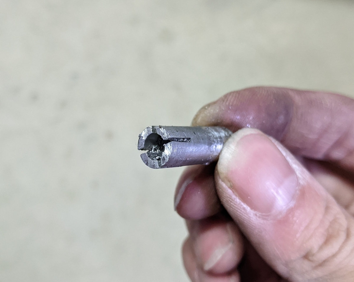 その後、先端を0.5mm程度残して7.5mmに外径を仕上げ、先端を十字に割りました。