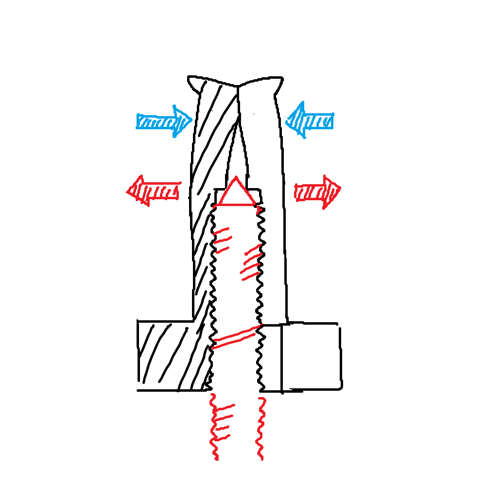 押しボルトがプーラを広げる位置が浅いと下図のように先端を広げようとする力(赤)と、ベアリングの内輪が抑え込む力(青)がずれて、先端がバナナプラグ状に変形してしまって内輪を保持する力が働かないため、うまく機能しません。
